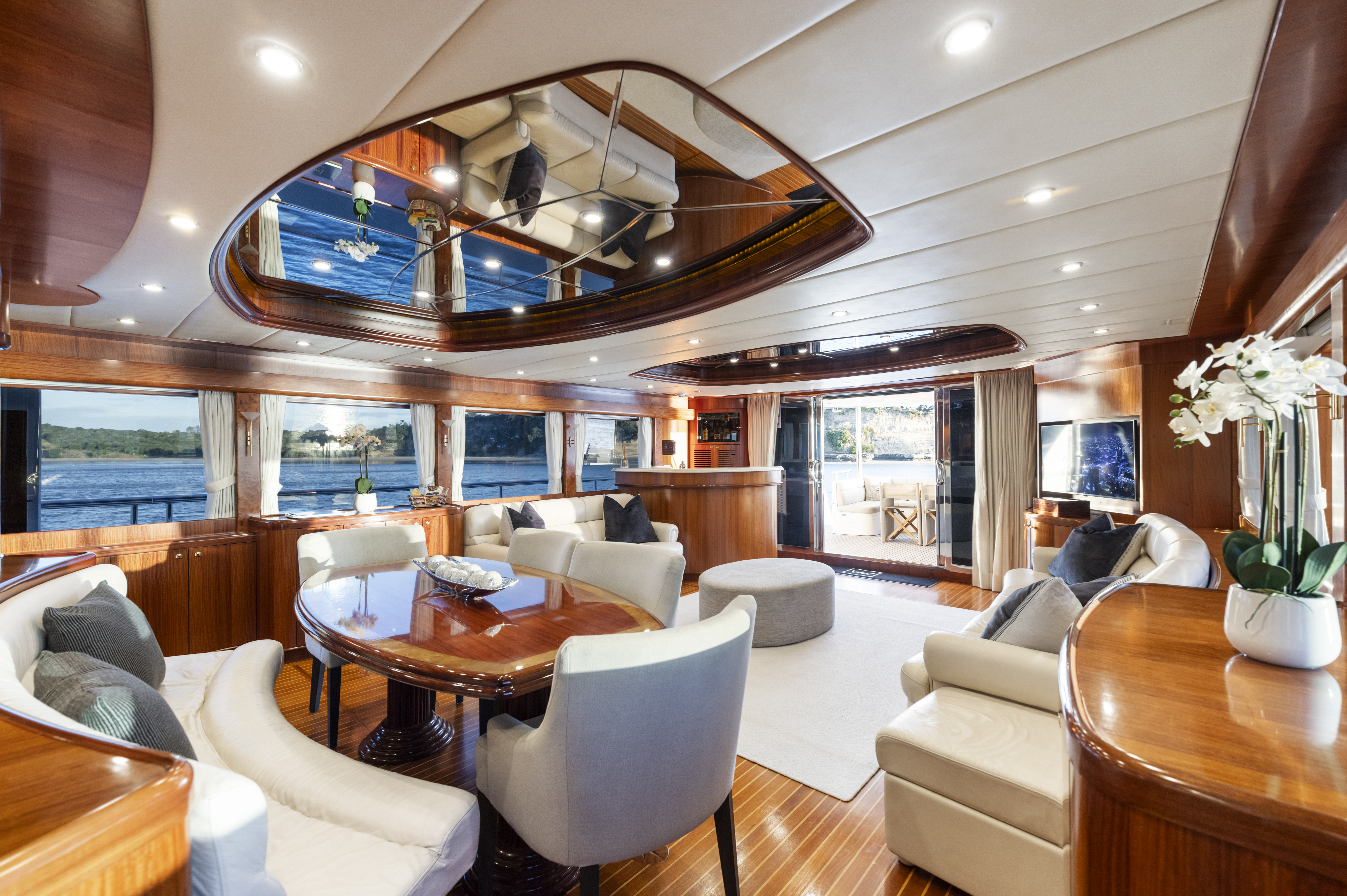 In the main deck saloon, you’ll find a teak-panelled setting that includes a marble-topped wet bar with an ice maker and fridge on the right side. On the opposite side, there’s a three-person sofa with two matching footstools facing an entertainment area equipped with a 44-inch Sony HD TV and a high-tech Crestron stereo surround sound system. Towards the front is the formal dining area, providing seating for eight guests and storage cabinets on both sides for glassware, china, and cutlery.