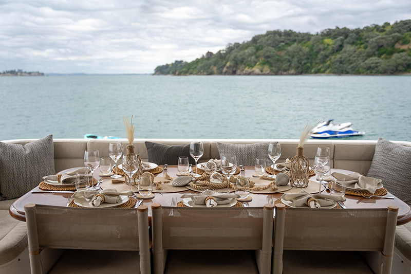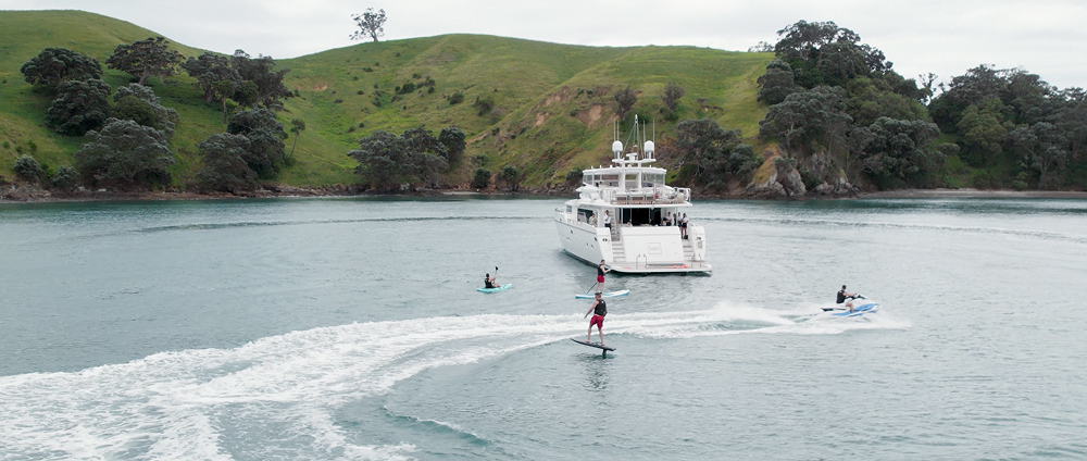 Your captain, well-versed in the Gulf’s secrets, charts a course that balances adventure and relaxation. Anchoring in a secluded bay and simply enjoying the escape from the city with the stunning backdrop of the Hauraki Gulf or perhaps take on the more active pursuits including a range of water sports such as kayaks, paddleboards, a two-person jet ski and e foil board. There is also a 5.50m tender which can accommodate anyone interested in more adrenaline-pumping water activities such as biscuiting, skiing and knee boarding. This type of water adventure promises thrills, spills, and endless laughter.